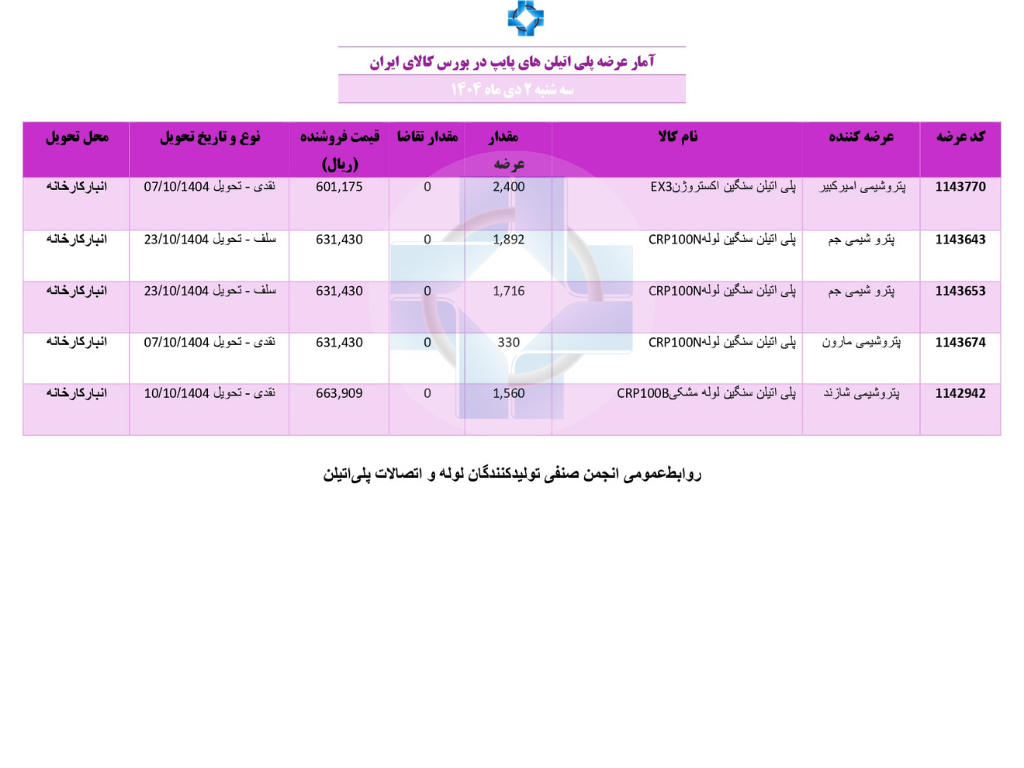 آمار عرضه پلی‌اتیلن‌های پایپ در بورس کالای ایران ۲ دی ماه 1404