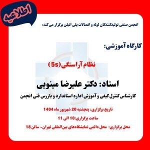 انجمن صنفی تولیدکنندگان لوله و اتصالات پلی اتیلن برگزار می کند: کارگاه آموزشی: نظام آراستگی (5s) استاد: دکتر علیرضا مینویی زمان برگزاری: پنج شنبه ۲۰شهریور