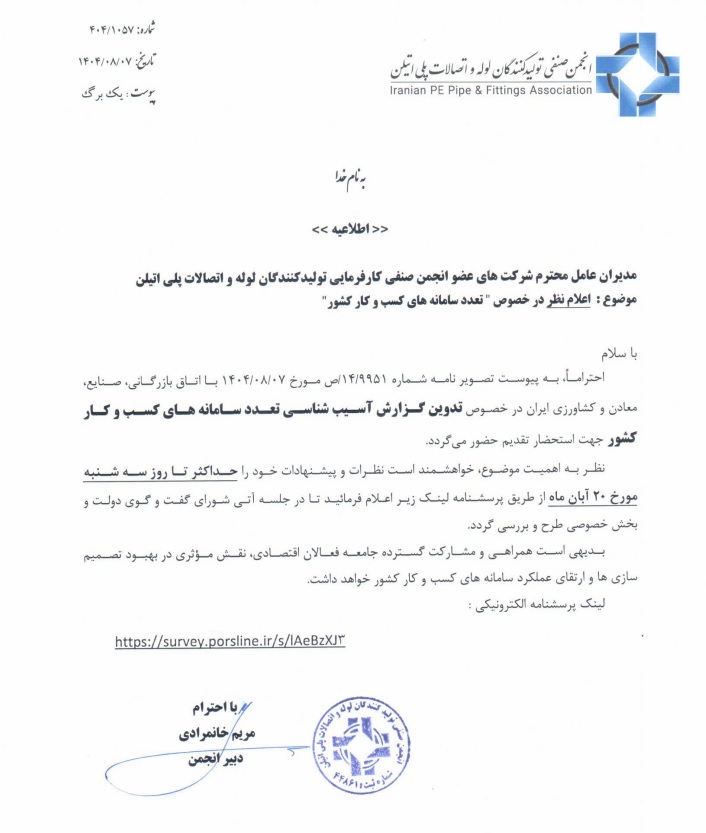 به آگاهی میرسد، با توجه به ضرورت جمعآوری دیدگاهها درباره آسیبشناسی تعدد سامانههای کسبوکار کشور، خواهشمند است نظرات کارشناسی خود را از طریق پرسشنامه الکترونیکی زیر حداکثر تا روز سهشنبه ۲۰ آبانماه ۱۴۰۴ ارسال فرمایید.