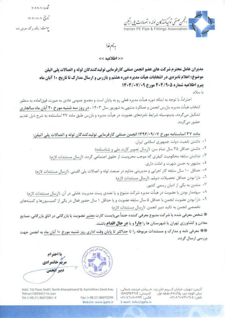 به اطلاع اعضای محترم انجمن صنفی کارفرمایی تولیدکنندگان لوله و اتصالات پلی‌اتیلن می‌رسد؛ پیرو اطلاعیه شماره ۹۰۵/۴۰۴ مورخ ۹ مهرماه ۱۴۰۴،