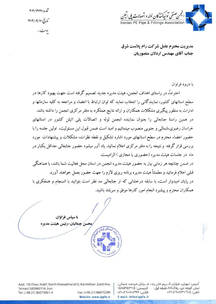 مهندس محسن جمالیان رئیس هیئتمدیره انجمن صنفی تولیدکنندگان لوله و اتصالات پلیاتیلن، در راستای سیاستهای دوره جدید و با هدف تقویت ارتباطات استانی، پیگیری مشکلات واحدهای تولیدی و هماهنگی با دستگاههای اجرایی، «مهندس اردلان منصوریان» مدیرعامل شرکت رامپلاست شرق را بهعنوان نماینده رسمی انجمن در استانهای خراسان رضوی، خراسان شمالی و خراسان جنوبی منصوب کرد.