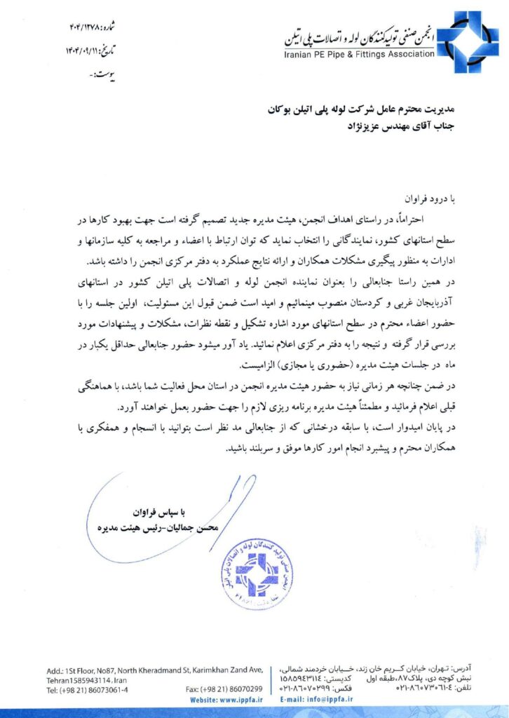 به گزارش روابط عمومی انجمن صنفی تولیدکنندگان لوله و اتصالات پلیاتیلن، مهندس محسن جمالیان رئیس هیئتمدیره انجمن، طی حکمی مهندس عزیزنژاد مدیرعامل شرکت لوله پلیاتیلن بوکان را بهعنوان نماینده انجمن در استانهای آذربایجان غربی و کردستان منصوب کرد. این تصمیم در چارچوب رویکرد تازه هیئتمدیره برای تقویت حضور استانی و ارتباط نزدیکتر با واحدهای تولیدی اتخاذ شده است.