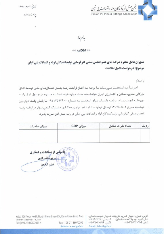 درخواست تکمیل اطلاعات در راستای تکمیل مدارک جهت رتبه بندی اتاق بازرگانی، صنایع، معادن وکشاورزی ایران