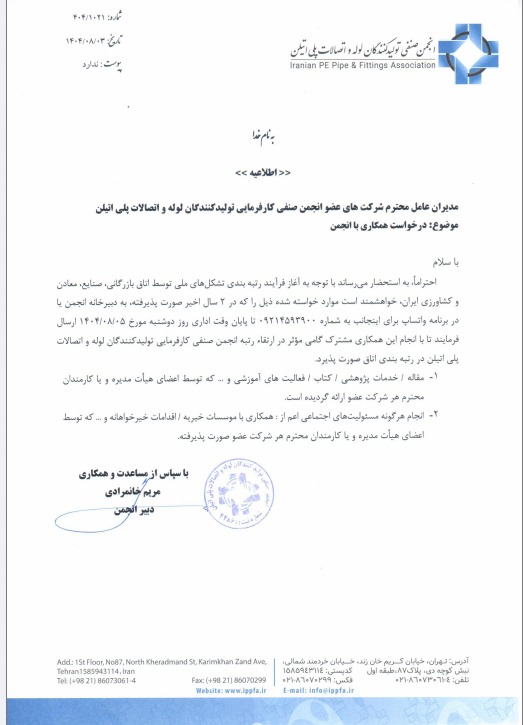 درخواست همکاری با انجمن مبنی بر ارسال مدارک لازم جهت رتبه بندی اتاق بازرگانی، صنایع، معادن وکشاورزی ایران