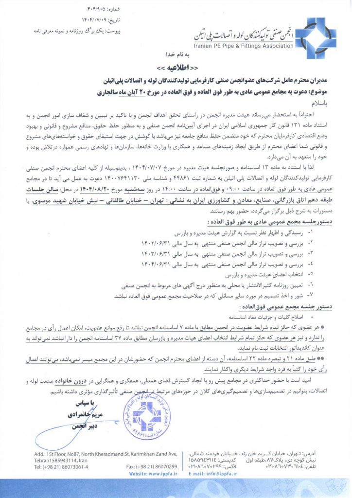 به اطلاع اعضای محترم انجمن صنفی کارفرمایی تولیدکنندگان لوله و اتصالات پلیاتیلن میرساند، مجامع عمومی عادی بهطور فوقالعاده و فوقالعاده انجمن در روز سهشنبه مورخ ۲۰ آبانماه ۱۴۰۴ برگزار میشود.