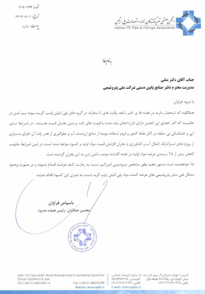 در مکاتبه رسمی با مدیریت دفتر صنایع پایین‌دستی شرکت ملی پتروشیمی، مهندس جمالیان رئیس هیئت‌مدیره انجمن صنفی لوله و اتصالات پلی‌اتیلن نسبت به کاهش بیش از ۲۵ درصدی عرضه مواد اولیه پلی‌اتیلن پایپ‌گرید طی هفته گذشته، هشدار داد.