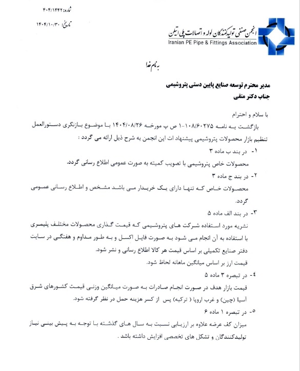 انجمن صنفی تولیدکنندگان لوله و اتصالات پلیاتیلن طی نامهای رسمی خطاب به دکتر محمد متقی، مدیر محترم توسعه صنایع پاییندستی شرکت ملی صنایع پتروشیمی، پیشنهادات خود را برای بازنگری دستورالعمل تنظیم بازار محصولات پتروشیمی ارائه کرد.