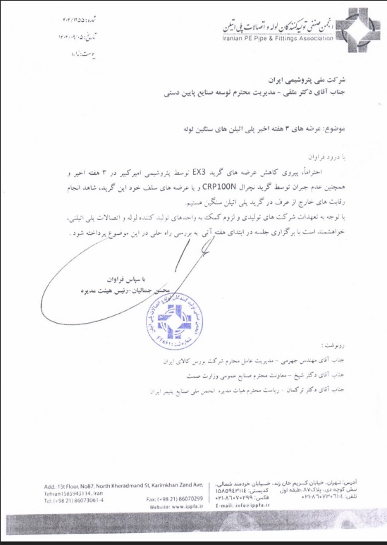 در این نامه که به امضای مهندس محسن جمالیان، رئیس هیئت‌مدیره انجمن رسیده است، به‌طور مشخص به کاهش عرضه گرید 3EX توسط پتروشیمی امیرکبیر اشاره شده و اعلام شده است که عرضه‌های جایگزین از جمله گرید نچرال ON10CRP و عرضه‌های سلف مرتبط با آن نیز نتوانسته‌اند کمبود موجود را جبران کنند.