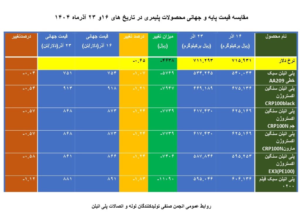 به گزارش روابط عمومی انجمن لوله و اتصالات پلی اتیلن؛ بررسی مقایسهای قیمتهای پایه محصولات منتخب پلیاتیلنی در بازه ۱۶ تا ۲۳ آذرماه نشان میدهد که اغلب گریدهای پرمصرف بازار پلیاتیلن با روند کاهشی قیمت مواجه شدهاند؛ روندی که همزمان با افت نرخ دلار مبنا و کاهش قیمتهای جهانی رقم خورده است.