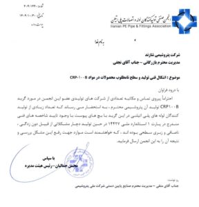 پیگیری انجمن لوله و اتصالات پلیاتیلن درباره کیفیت گرید Crp100b