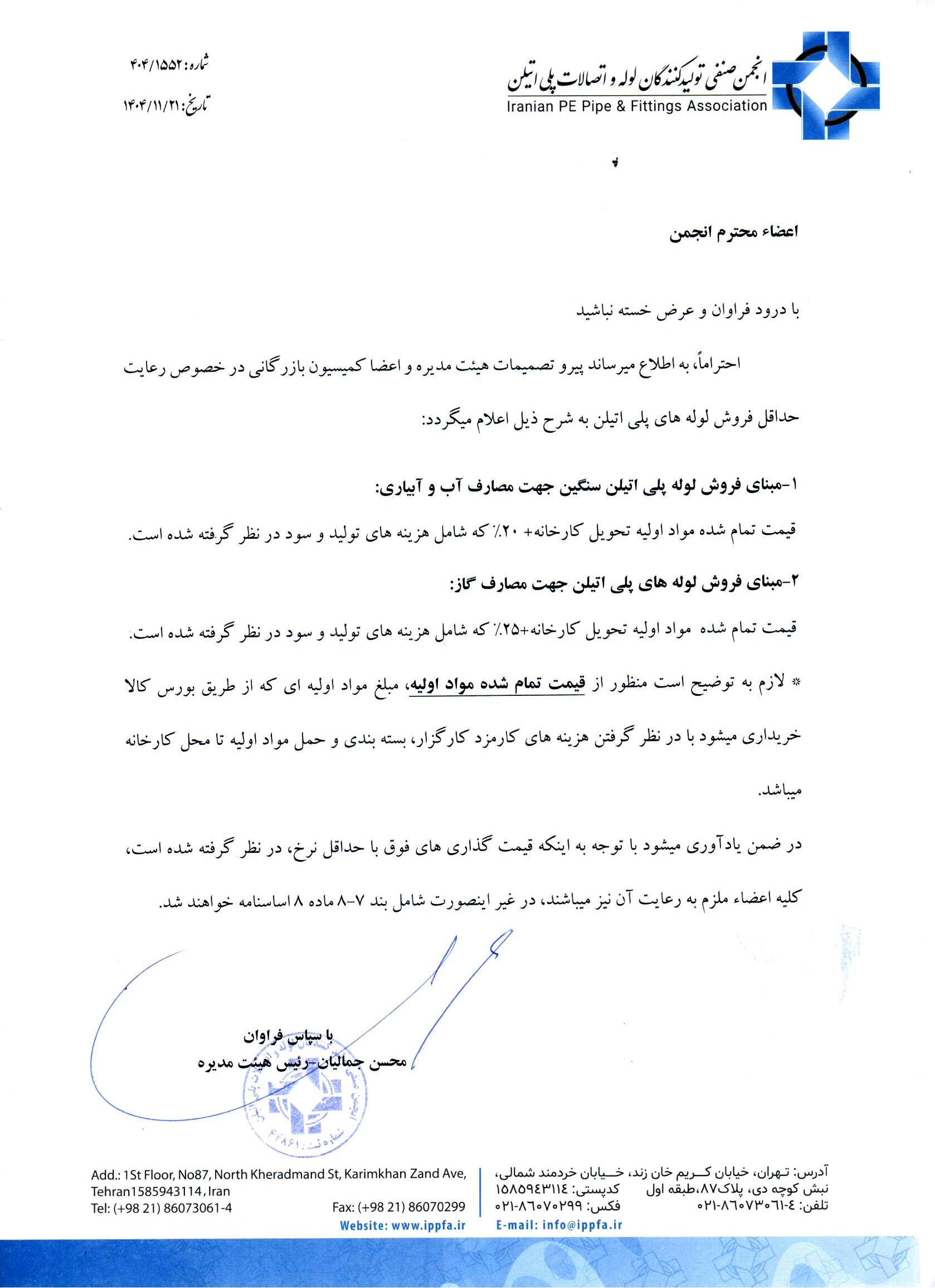 رعایت حداقل قیمت فروش لوله های پلی اتیلن توسط اعضاء محترم انجمن