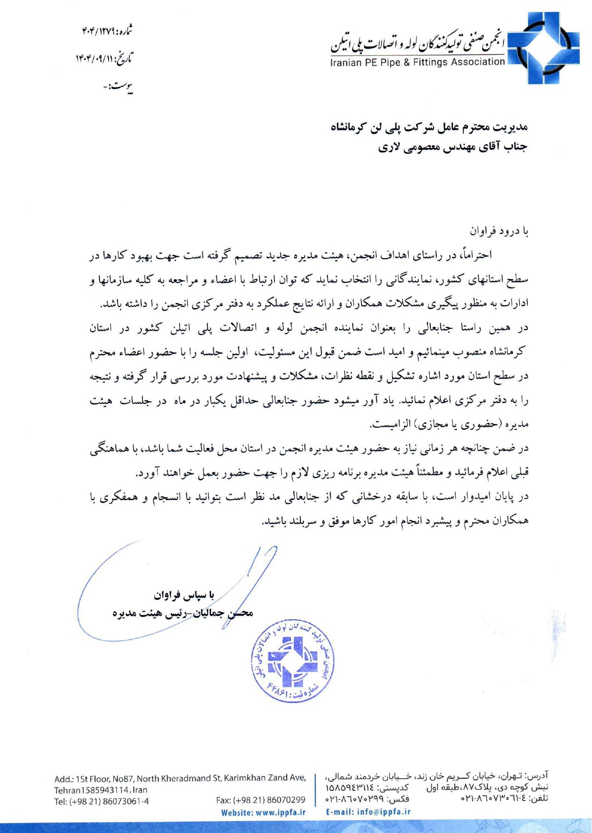 انتصاب نماینده انجمن صنفی لوله و اتصالات پلیاتیلن در استان کرمانشاه